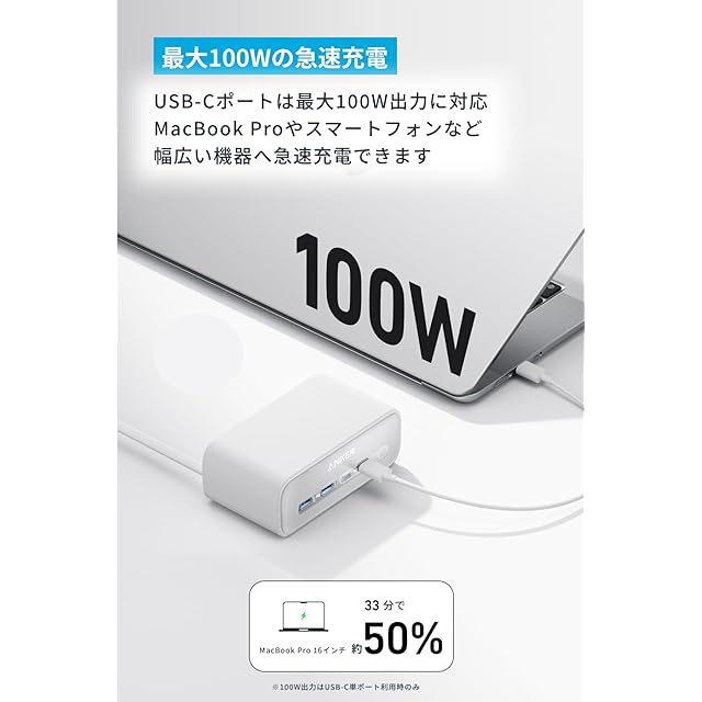 最大100Wの急速充電:USB-Cポートは最大100W出力に対応し、MacBook ProなどのノートPCやスマートフォンなど幅広い機器へ急速充電できます (100W出力はUSB-C単ポート利用時のみ) 。