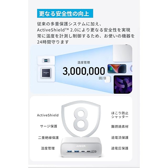 更なる安全性の向上:従来の多重保護システムに加え、 ActiveShieldTM 2.0により更なる安全性を実現。常に温度を計測し制御するため、お使いの機器を 24時間守ります。