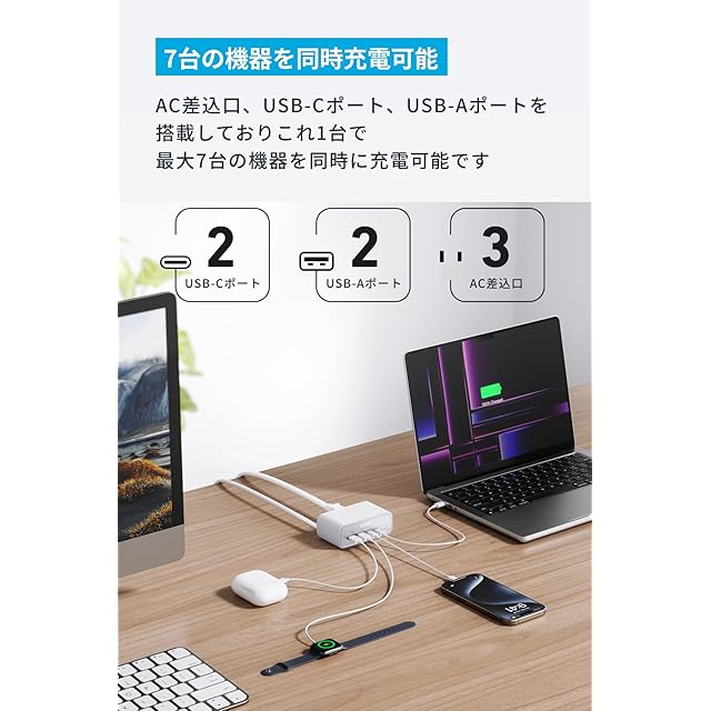 7台の機器を同時接続可能:AC差込口(×3)、USB-Cポート(×2)、USB-Aポート(×2)を搭載。これ1つで最大7台の機器に同時に接続可能です。