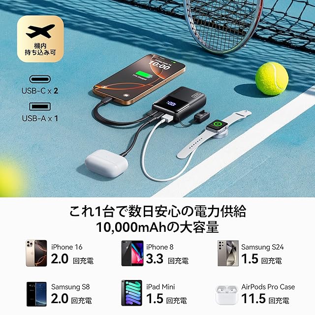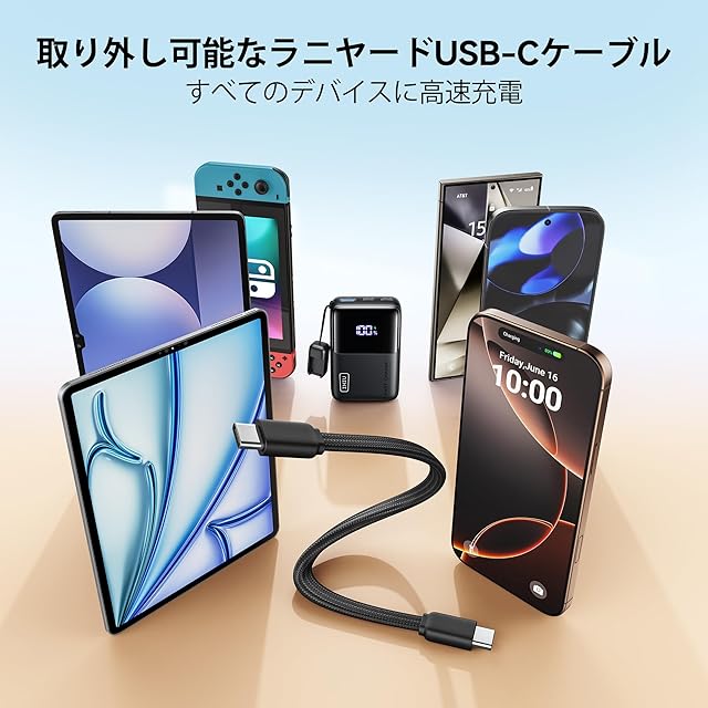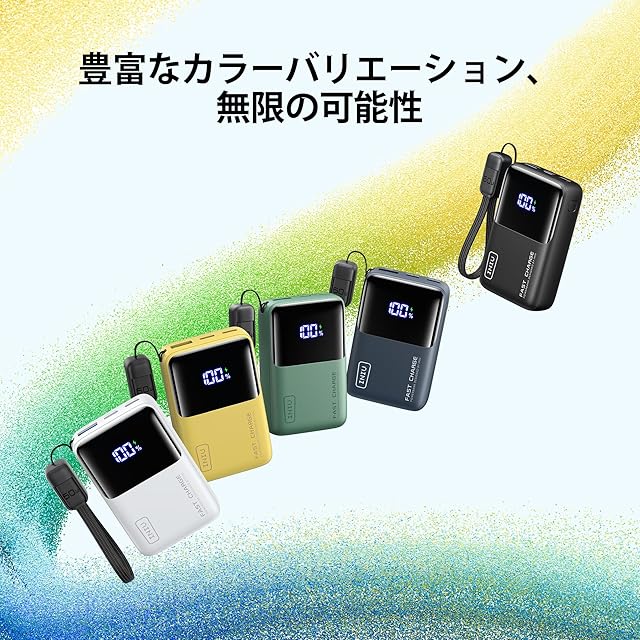 【INIU・安全な急速充電プロ】世界中で3,800万人以上にご愛用いただいている、安全性に配慮した充電体験をお届けします。INIUの充電製品は厳格な安全基準に従い、全製品に業界をリードする3年間の品質サービスを提供しています。 【INIU、最小クラスの10,000mAhを再定義】INIUの最新の10,000mAhモバイルバッテリーは、業界初のTinyCell Proバッテリーを搭載し、最小サイズの基準を打ち立てました。従来の10,000mAhよりも45%小型化されており、そのコンパクトさは実際に見て実感していただけます。 【45Wフルスピード充電 最新iPhone 16 & Samsung S24】最大出力45Wで、PD、QC、Samsung Super Fast Chargingに対応。iPhone 16やSamsung S24でも、スピードと便利さを両立させたフルスピード充電を楽しめます。 【MacBookも充電可能、ミニサイズで】小さいながらもパワフル—従来のノートパソコン用モバイルバッテリーが大きくて重いのに対し、超ミニサイズの10,000mAhは予想を超えた性能を発揮。45Wの出力で、MacBook Airにも対応し、わずか25分で42%の充電が可能です。緊急時にも便利で、かつ持ち運びやすいサイズです。 【取り外し可能なラニヤードUSB-Cケーブル】INIUのモバイルバッテリーには、新たに取り外し可能なラニヤードケーブルが搭載されており、使い勝手が向上。USB-C to Cケーブルは充電・再充電の両方に対応し、取り外せるので他のモバイルバッテリーやデバイスにも簡単に使い回しができます。 【1日中使える10,000mAh】日常使いや短期間の旅行、出張に最適な10,000mAh。iPhone 16を2回充電でき、Samsung S24を1.5回充電できます。充電切れを気にせず、安心して使えるパワーです。
