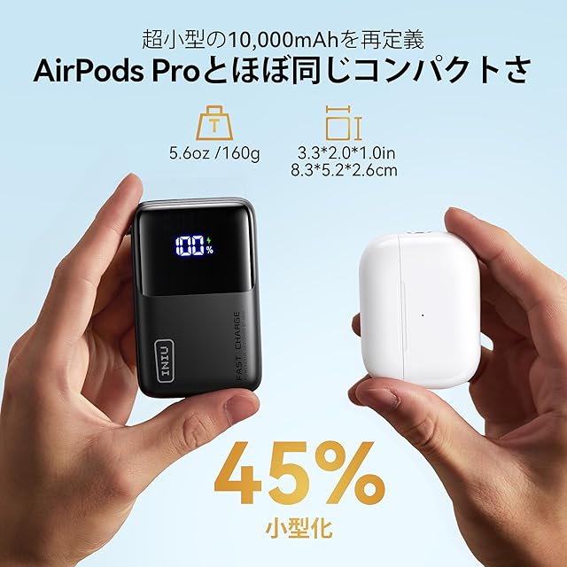 【INIU、最小クラスの10,000mAhを再定義】INIUの最新の10,000mAhモバイルバッテリーは、業界初のTinyCell Proバッテリーを搭載し、最小サイズの基準を打ち立てました。従来の10,000mAhよりも45%小型化されており、そのコンパクトさは実際に見て実感していただけます。