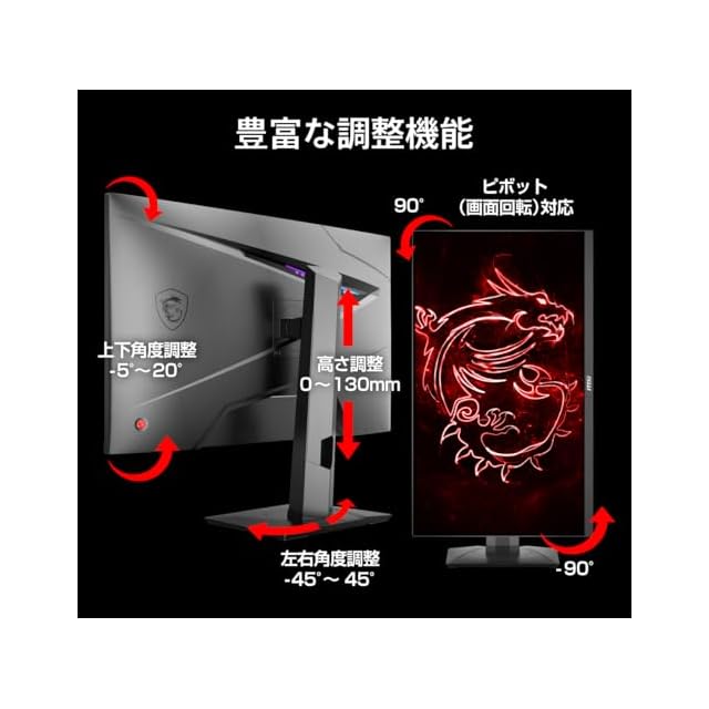 ●本体サイズ:約614 × 197 × 403(mm)●本体重量:約6.1kg●電源タイプ:120W ACアダプタ●上下角度調節(チルト):-5° ~ 20°●高さ調整:0 ~ 130(mm)●左右角度調整(スイベル):-45° ~ 45°●画面回転(ピボット):-90° ~ 90°●アンチフリッカー、アンチモーションブラー、ブルーライトカット、ナイトビジョン、Adaptive-Sync、DisplayHDR 400、Gaming Intelligence、KVMスイッチ、Mystic Light、PIP/PBP、USBハブ機能、USB Power Delivery (65W)、VESA75(付属のスペーサーネジにて対応)
