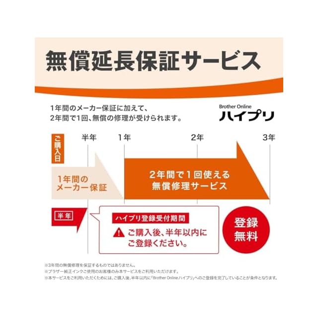 登録設定をすることでブラザーのポイントサービス「トク刷るポイント」が利用できます。また、登録するだけで、メーカー1年に加えて、1年間に1回使える延長の無償修理サービス「ハイプリ」が利用できます。※2年間の無償修理をするものではありません。※ブラザー純正インクご使用のお客様のみ対象。※プリンター本体をインターネットに接続できるネットワーク環境(有線LAN/無線LAN)でご使用することが条件となります。(プリンター本体にUSBケーブルのみを接続してご使用している場合は、本サービスはご利用いただけません。)※本サービスをご利用いただくためには、ご購入後、半年以内にBrother Online「ハイプリ」へのご登録を完了していることが条件となります。