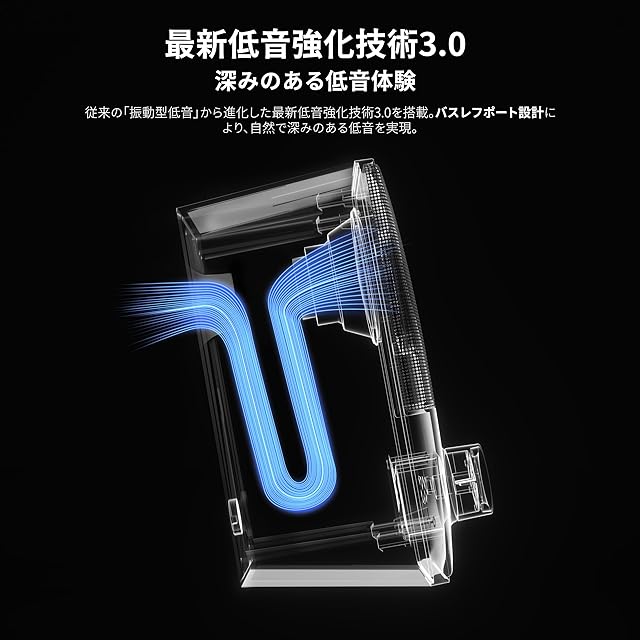 【最新バスレフ低音強化技術&深みのある低音体験】独自設計の曲線インバーターチューブ型バスレフポートが風雑音を効果的に抑え、深く沈み込む低域と力強い迫力を実現。従来の密閉型構造に比べて、低域の伸びと明瞭感がさらに向上。量感豊かな低音と高い解像度を両立し、“こもり感”のないシャープな音質をお楽しみいただけます。