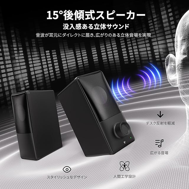 商品名:【業界初 15°後傾式スピーカー&最新Bluetooth5.4対応】 kstime PCスピーカー バスレフ低音強化 ゲーミングスピーカー Hi-Fiステレオ 有線・無線接続対応 USB給電 AUX対応 最大出力14W 内蔵マイク 前面イヤホン端子付き モニター タブレット スマートフォン対応 パソコンスピーカー ブラック