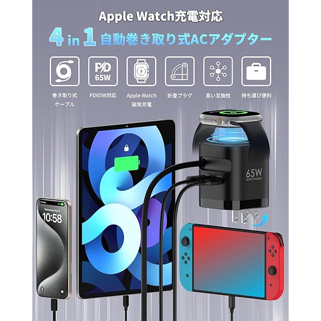 【新登場 自動巻き取り式】for アップルウォッチ 充電器 65w 急速充電 ワイヤレス Apple watch 充 電器 type-c 対応【伸縮70㎝/折畳み式/4台同時充電可/超低温/PSE技術基準適合/GaNIII技術】USBコンセントMacbook/apple watch SE/10/9/8/iphone16/15/iPad/PC/Dell/Hp/東芝対応 旅行 黒 | TREND DESIGN 家電専門店