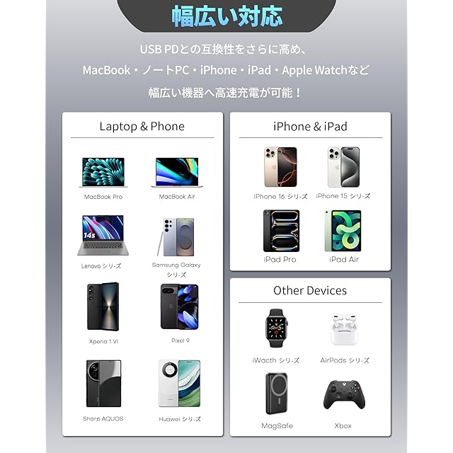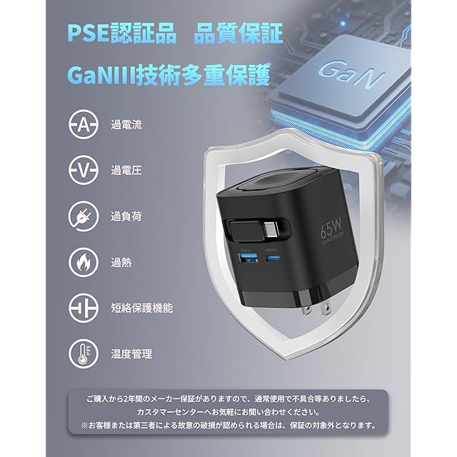 GaNⅢ搭載⇒窒化ガリウム(GaNⅢ)技術を採用することで高出力かつコンパクトな設計を実現。高い安全性:従来製品と同じ多重保護システムに加え、により優れた安全性を実現。独自の温度管理と接続端末の保護システムでお使いの機器を24時間守ります。
