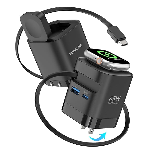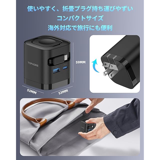 TOPADRE 65W 自動巻き取り式 4in1 急速充電器(GaN III搭載/PSE認証) デスク整理&旅行に最適なコンパクト設計の高性能充電ソリューション 【製品特徴】 自動巻き取り式デザインでスッキリ収納 サイズ: 5.9×5.3×5.3cmの超コンパクト設計。 ケーブル長: 3cm~70cmまで自由に伸縮可能(軽くプレスするだけで巻き取り/伸ばし可能)。 デスク周りの配線整理や旅行時の荷物削減に最適。ケーブルの絡みや摩耗を防ぎ、ミニマルな生活を実現。 4in1 超高速充電(最大65W出力) PD3.0/QC4+対応で、MacBook Air M2(30分で51%)、iPhone 16(同60%)などを急速充電。 同時充電可能ポート: Type-C×2(C1/C2: 各65W Max) USB-A×1(30W Max) 磁気ワイヤレスApple Watch充電(2W) スマホ・タブレット・ノートPC・スマートウォッチの同時充電に対応。 安全性と耐久性 PSE認証済み(日本国内電気安全基準適合)。 GaN III(次世代半導体)採用で小型・高効率・低発熱を実現。 過電流/過電圧/ショート/過熱/過電力/干渉/低電圧の7重保護機能搭載。 幅広い互換性 対応規格: PD3.0、QC4+/3.0/2.0、PPS、SCP、FCP、AFC、PE+など。 MacBook・iPhone・Android・iPad・SwitchなどUSB-C対応機器全般で使用可能。 信頼のとアフターサポート 巻き取り機構の耐久性強化設計。 2年間のメーカー付き(故意の破損を除く)。 【こんな方におすすめ】 デスク周りをスッキリさせたい方 旅行や出張時に「ケーブル忘れ」「絡まり」を解消したい方 複数デバイスを同時に高速充電したい方 安全性とコンパクトさを両立させたい方 ※ご注意 Apple Watch充電は磁気ワイヤレスのみ対応(ケーブル式不可)。 第三者による故意の破損は対象外です。