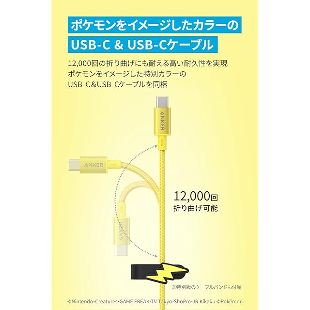 USB-C & USB-C ケーブル同梱:12,000回の折り曲げにも耐える高い耐久性を実現したUSB-C & USB-Cケーブルをポケモンに合わせたカラーの特別仕様で同梱しています。