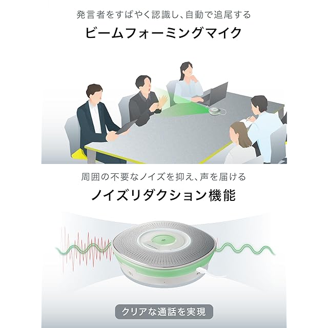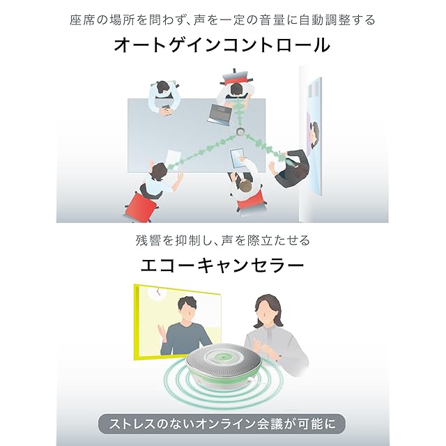 周囲の不要なノイズを抑えるノイズリダクションと残響を抑制するエコーキャンセラー:ノイズリダクション機能でエアコンやプロジェクターなどの環境騒⾳(ノイズ)を低減。どこにいても相⼿にクリアな声を届けます。スピーカーから出る⾳が、マイクに回り込むことでエコーは発⽣します。そこで、マイクへの⾳の回り込みを低減する機能を搭載し、スムーズな双⽅向の通話を実現しました。