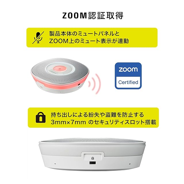 Zoom Certified を取得した信頼の性能:Zoom 社の認証を取得しているため、Web 会議ツール「Zoom」での操作と連動できます。ミュートパネルをタップするだけで、Zoom アプリのミュート操作が可能。発⾔した後に、PC上でカーソルを合わせてミュート、といった⼀連の動作ストレスから解放されます。