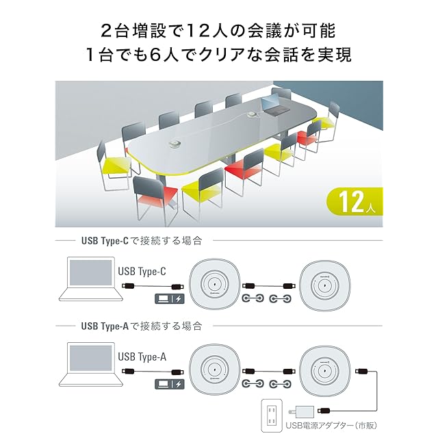 2 台連結接続により、最大12 人での会議に対応:推奨距離は半径1m 以内(最⼤2m以内)、推奨最⼤⼈数は6名での使⽤が可能。また、本製品を2台連結することで、最⼤12⼈まで同時に使えます。⼤きな会議室でも声を張らずに話せるだけでなく、どの席でも聞こえやすい特徴を持ちます。