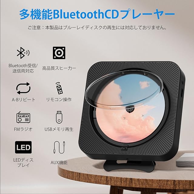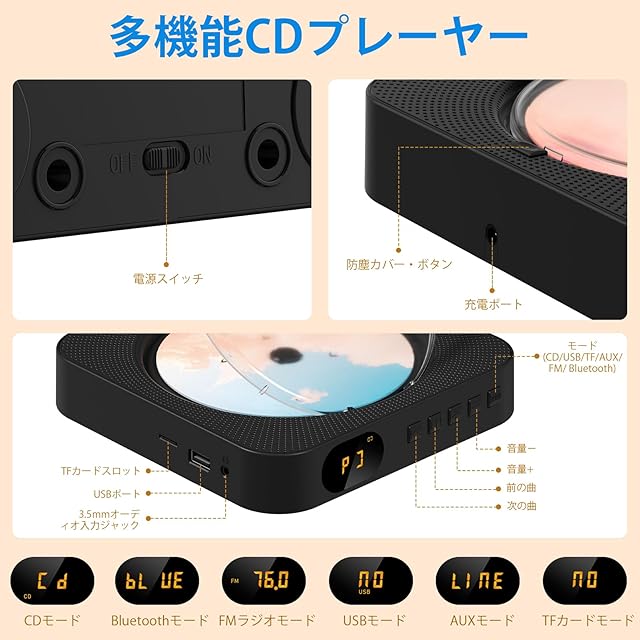 【多機能コンパクトCDプレーヤー】このbluetooth対応cdプレーヤーは、手のひらサイズに多彩な機能を詰め込みました。CD/CD-R/CD-RW/MP3/WMA形式に対応したポータブルCDプレーヤーとしてはもちろん、FMラジオ、Bluetooth対応Hi-Fiスピーカー、TFカード再生、ミニホームスピーカー、さらにUSBメモリからの音楽再生にも対応。これ一台で、さまざまな音楽体験をお楽しみいただけます。