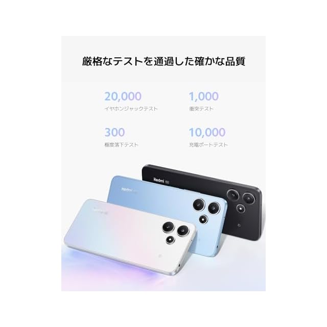 【厳格なテストを通過した確かな品質】Redmi 12 5Gの製造過程では、あらゆる予期せぬ出来事を想定した、厳格で優れた品質耐久テストが行われています。イヤホンジャックテストは20,000回、衝突テストは1,000回、極度落下テストは300回、充電ポートテストは10,000回行われています。
