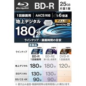 【テレビ番組録画に対応】スピンドルケースに50枚入ったAACS対応BD-R(1回記録用)です。容量25GB、地上デジタルで180分、書き込み速度は6倍速です。一度だけ録画/記録を行うことができるため、メディアを長期的に保存する時におすすめです。上書きする必要のないデータを保存したり、人に大容量データを渡したりする際などに向いています。レコーダーなどでデジタル放送の「ダビング10※」番組や「1回だけ録画可能※」な番組を録画することができます。 ※Blu-rayレコーダー及びプレイヤーが対応している必要があります。