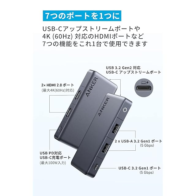 7つのポートを1つに:USB 3.2 Gen2 対応のUSB-Cアップストリームポート、USB PDに対応した最大100W入力が可能なUSB-Cポート、4K (60Hz) 対応のHDMIポート2つ、データ転送用USB 3.2 Gen1 対応 (5 Gbps) のUSB-Cポート1つとUSB-Aポート2つへの接続がこれ1台で可能です。