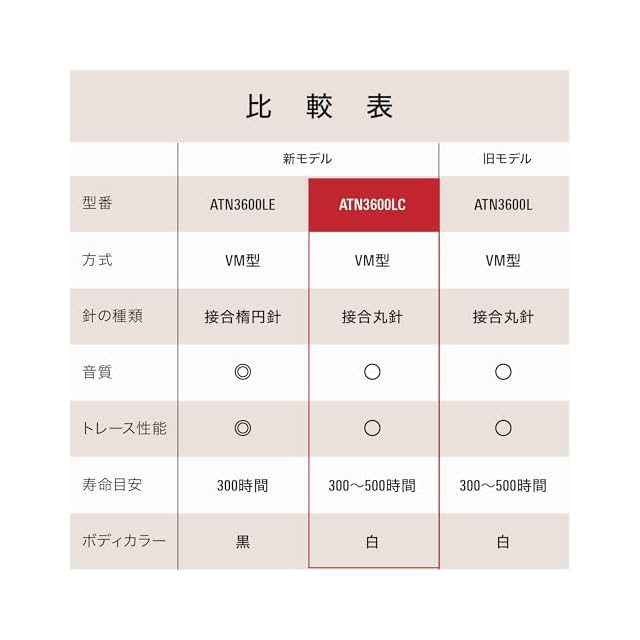 時代に応じた外観にアップデート:このたび、長らく愛された接合丸針『ATN3600L』の使いやすさや品質・音質はそのままに、時代に応じた外観にアップデート。新たに『ATN3600LC』として発売します。両モデルともに『ATN3600L』との互換性があるため、簡単に交換可能です。