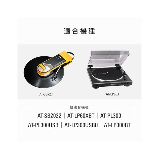 オーディオテクニカのレコードプレーヤー専用交換針:適合機種。AT-SB727、AT-SB2022、AT-LP60X、AT-LP60XBT、AT-PL300、AT-PL300USB、AT-PL300USBII、AT-PL300BT