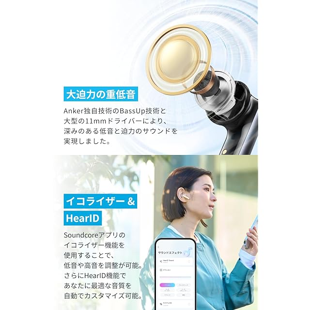 大迫力のサウンド:Anker独自技術のBassUp技術と大型の11mmドライバーにより、深みのある低音と迫力のサウンドを実現しました。またSoundcoreアプリでお好みの音質に調整いただけます。