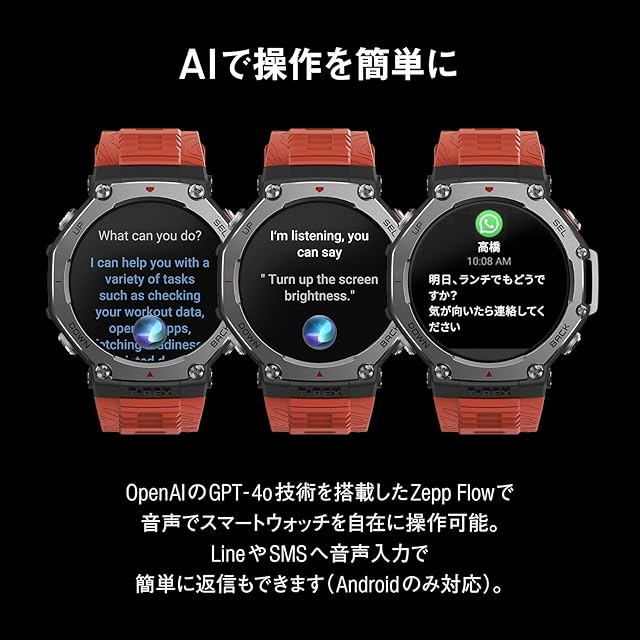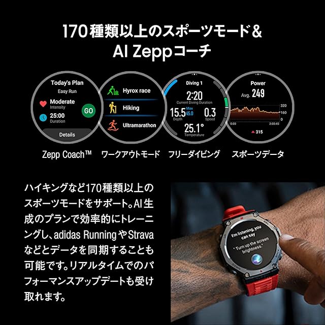 【進化した長時間バッテリー】T-Rex2から進化した長時間バッテリーは通常使用で27日、GPSの最大バッテリー寿命は180時間も稼働します。3週間以上のバッテリー性能であなたの長い冒険をサポートします。(※バッテリー持続時間は、メーカーの設定した条件下で算出されたものです。機能の設定および使用回数、動作条件、その他の要因によって異なる場合があります。)【最新AIが統合されたZEPP OS 4.0】最新AI技術による音声操作機能である”Zepp Flow”を搭載しており、さらに100種類以上のミニアプリをダウンロードしてスマートライフの選択肢をより増やします。