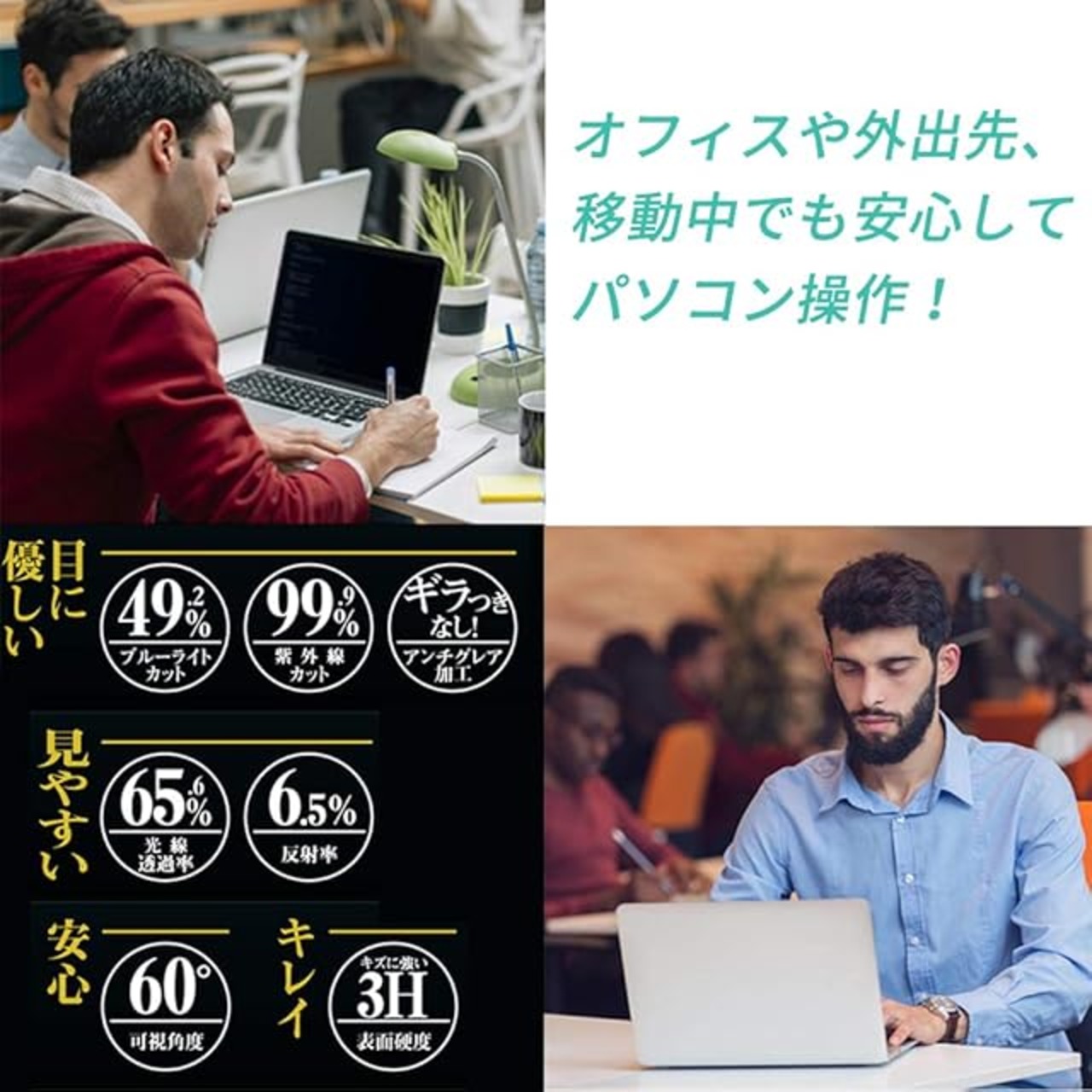 ■【ブルーライトカット&反射軽減】ブルーライトカット率:49% 紫外線カット率:99.9%。→ブルーライトはディスプレイが発する光の中に青いもの、あび過ぎると目の水晶体や角膜に吸収されずに綱膜の機能を低下を引き起こす場合があると言われています。