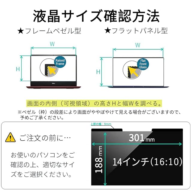 ■【プライバシー保護】視野角 60度、正面から見れると画面はクリアでも、隣の席からは真っ暗に映る偏光性を有する「覗き見防止フィルター」です。【対応機種】14インチ 縦横比16:10 寸法:フィルター部分のみ 301×188mm(縦幅/横幅のばらつき:+/-1mm程度)。上部の黒いマグネット部分は約9mm。画面とベゼルの高低差により画面がややぼやけて見える場合が御座います。