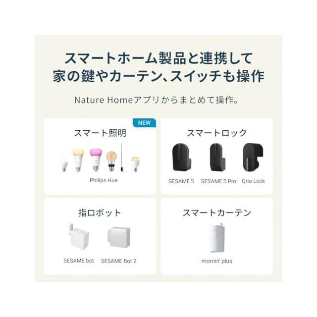 【他社デバイスにも対応】スマートロック製品の「Qrio Lock」と「SESAME5/5Pro」、指ロボット「SESAME bot」、めざましカーテン「mornin' plus」に対応しています。