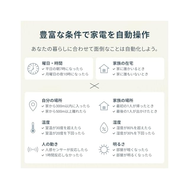 【7つの細やかなオートメーション】「曜日・時間、位置情報・温度」に加え、「湿度・照度・人感」の条件で家電を自動で操作。人が通ったら電気をオン、部屋が暗くなったら電気をオンということも可能です。