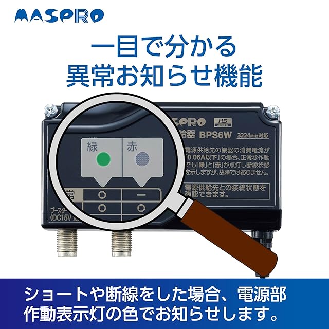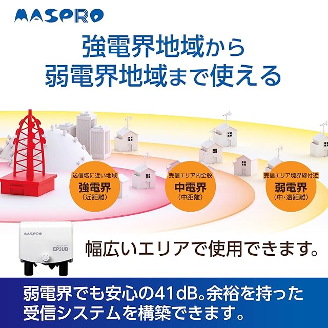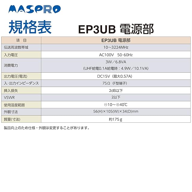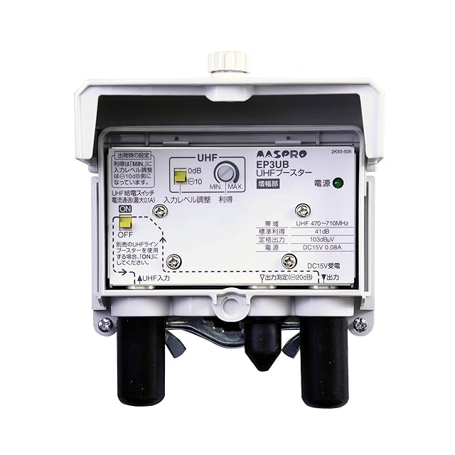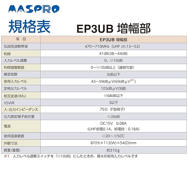 ●伝送周波数帯域:470~710MHz(UHF ch.13~52) ●利得:41dB(38~44dB) ●雑音 指数:3dB以下 ●定格出力レベル:103dBμV(9波) ●VSWR:3以下 ●入・出力インピー ダンス:75Ω(F型端子) ●使用温度範囲:-20~+50℃(増幅部)、-10~+40℃(電源部) ●電源部入力電圧:AC100V 50・60Hz ●電源部出力電圧:DC15V(最大0.57A) ●外観寸法(増幅部):87(H)×113(W)×54(D)mm ●外観寸法(電源部):56(H)×105(W)×34(D)mm ●個装重量:586g