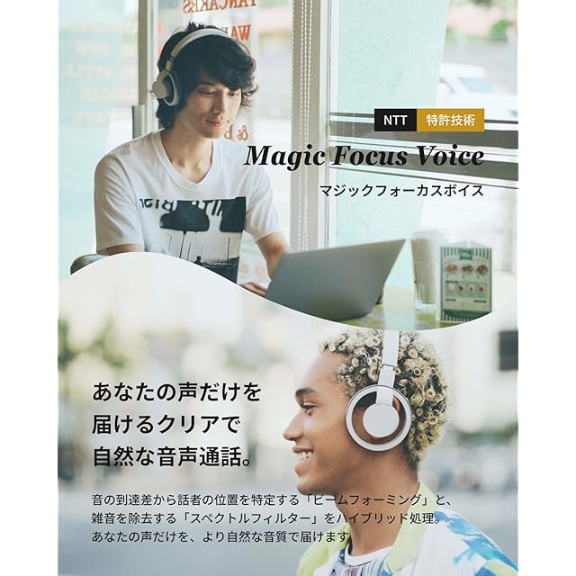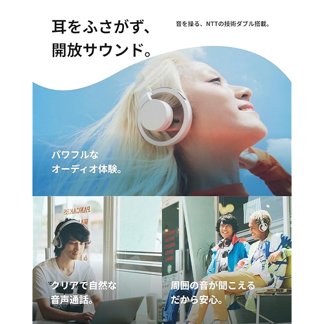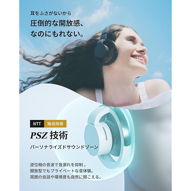 ブランド史上初、音を操るコア技術をW搭載。|通話や通信の課題解決から生まれた、音を操るコア技術をW搭載。耳をふさがないのに耳元に音を閉じ込めるNTT独自の「PSZ(パーソナライズドサウンドゾーン)」技術により、オープンイヤーなのに音漏れが気になりません。周囲の音をカットしてあなたの声だけ届けるNTTの特許技術「Magic Focus Voice」は、通話やオンライン会議での相手側の音のストレスを軽減します。