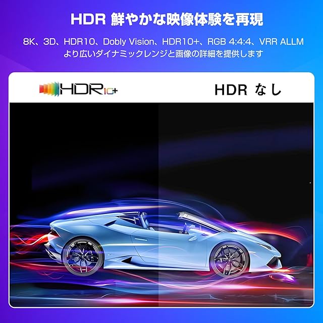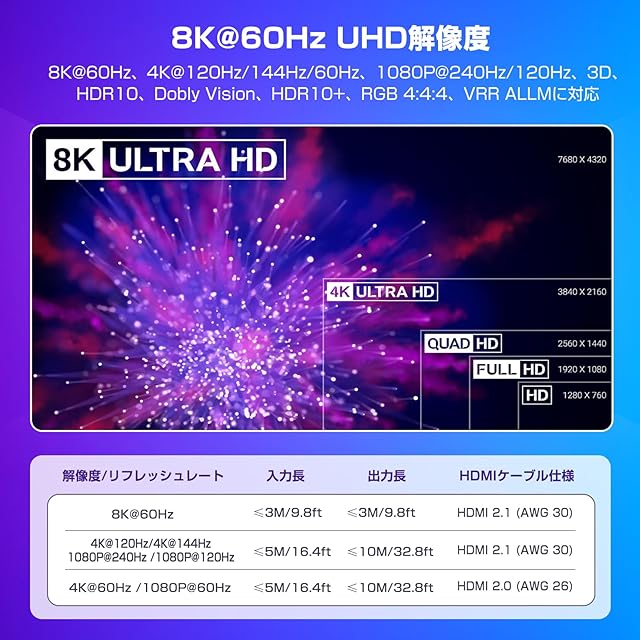 【8K UHD解像度】HDMIモニター分配器は、8K@60Hz、4K@120Hz/144Hz/60Hz、1080P@240Hz/120Hz、3D、HDR10、Dobly Vision、HDR10+、RGB 4:4:4、VRR ALLMに対応しています。 1080i、720P、576Pと下位互換性があり、遅延やフラッシュはありません。8K@60Hzの場合は、HDMI 2.1(AWG 30)ケーブル(入力/出力長≤3M)を使用してください。4K@120Hz/4K@144Hz/1080P@240Hz/1080P@120Hzの場合は、HDMI 2.1(AWG 30)ケーブル(入力長≤5M、出力長≤10M)を使用してください。4K@60Hz /1080P@60Hzの場合は、HDMI 2.0(AWG 26)ケーブル(入力長≤5M、出力長≤10Mを使用してください。
