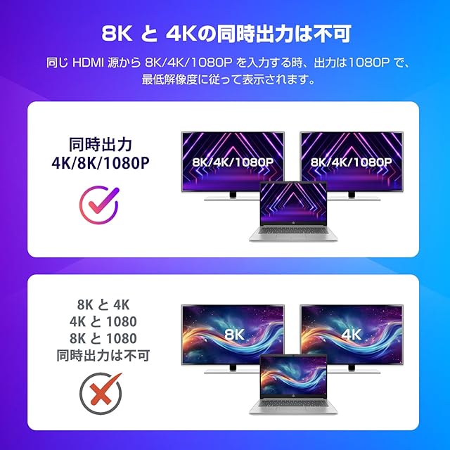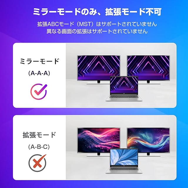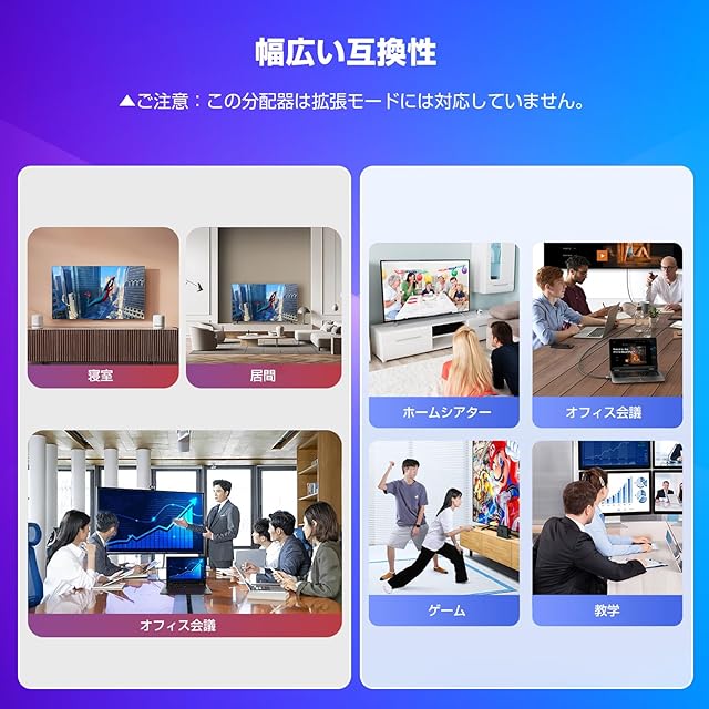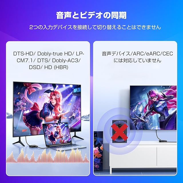【非対応】①拡張非対応、2台のモニターに異なるコンテンツを拡張できません。 (▲ご注意:画面のミラーのみであり、拡張はできません。) ②切替器ではありません。2つのHDMI入力信号を1台のモニターに接続できません。③音声分離器ではありません。サウンドバーなどの音声デバイスに接続できません。④ARC/eARCには対応していません。