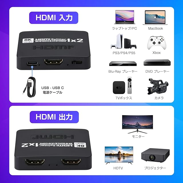 J-Wonlyus 8K@60Hz HDMI 分配器 1入力2出力 4K@120Hz 音声 ビデオ 同時出力 HDMI 2.1 スプリッター 付き 3D 1080p 拡張モードなし PS3/4/5、HDTV、ROKU 4、VCD/DVD プレーヤー、PC対応 (EDID機能、USB充電ケーブル付き) | TREND DESIGN 家電専門店