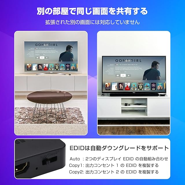 【スマートEDID管理】自動モードとEDIDコピーモードを搭載。自動モードでは一般的な最適な解像度に合わせ、コピーモードでは出力1の解像度を複製します。プラグアンドプレイで簡単に設定できます。(▲ヒント:最高のパフォーマンスを得るには、解像度の低いデバイスを出力1に接続してください。)