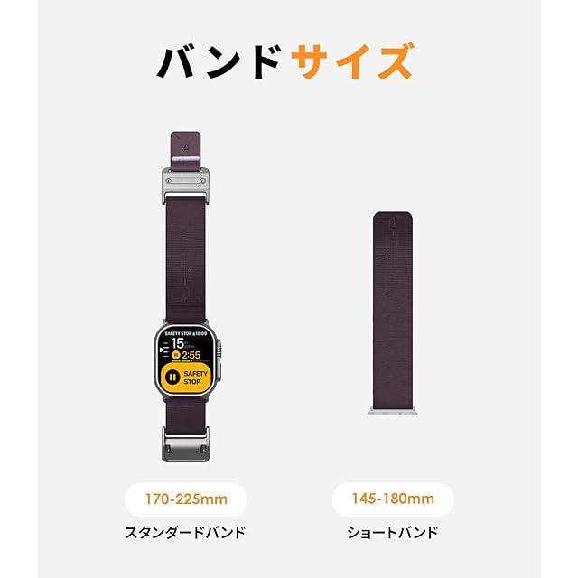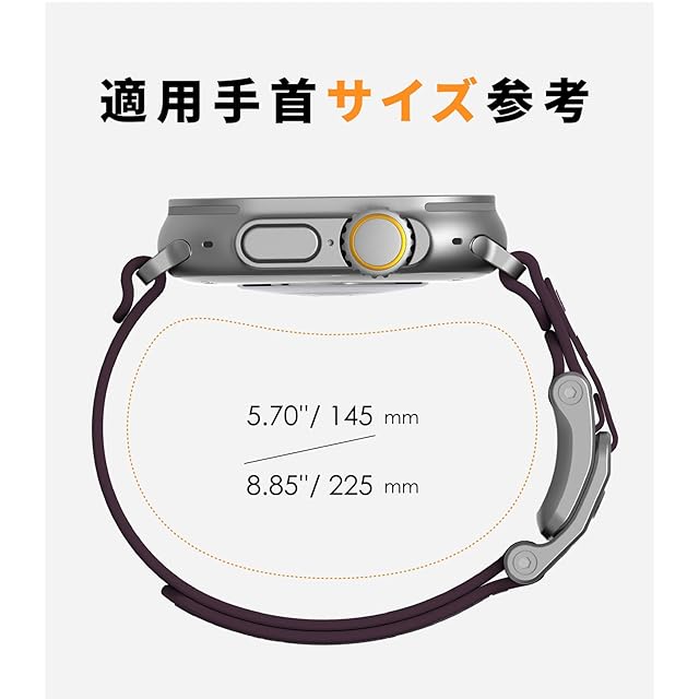【対応機種・サイズ】For Apple Watch Ultra 2/1 (49mm)、Apple Watch Series 10 (46mm)、Apple Watch Series 9/8/7 (45mm)、Apple Watch Series 6/5/4 /SE (44mm)、Apple Watch Series 3/2/1 (42mm)に対応。伸縮性である設計で、145mm―225mmの手首サイズに適しています。長さは無段階で自由に調整可能で、どんな手首でもフィットできます。男女兼用のApple Watch バンドです。 注意:38mm、40mm、41mmには対応していません