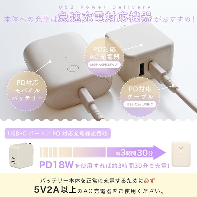 バッテリー本体への充電も早い:バッテリー本体への充電も、USB Power Deliveryに対応。最大18W(9V×2A)入力なら、わずか3.5時間でモバイルバッテリー本体を満充電にすることが可能です。※USB Power Deliveryに対応したAC充電器と充電ケーブルをご使用ください。