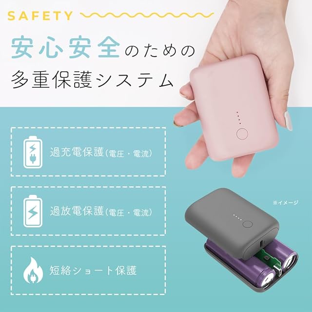 かしこく充電対応、多重保護システム搭載:デバイスに合わせて最適な給電を可能にする「かしこく充電」対応。USB Type-Aポートで、スマートフォンなどの機器を最大18W(9V×2A)で給電することが可能です。※接続機器の充電規格に応じて、最適な電流を流します。また過電流保護(電圧・電流)、過放電保護(電圧・電流)、短絡ショート保護を搭載しておりますので、モバイルバッテリーを長時間使用・充電しても、安全にお使いいただけるように設計されております。