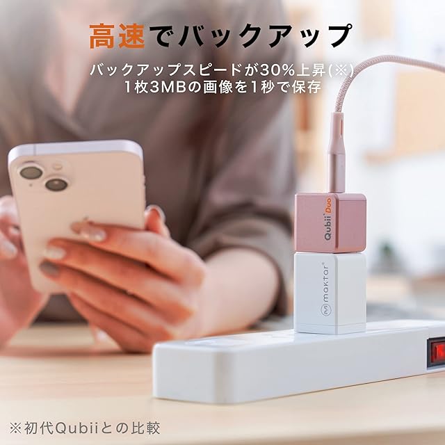 【Qubii Duoがあれば写真取り放題】寝る前にスマホ充電するだけでiPhoneの写真や動画を自動バックアップ!Qubiiがあれば、iPhoneの容量不足には困らず、写真を気兼ねなく取り放題!使いやすくて高速転送。簡単操作で手軽にiPhoneの写真をパソコンにデータ移行することも可能。