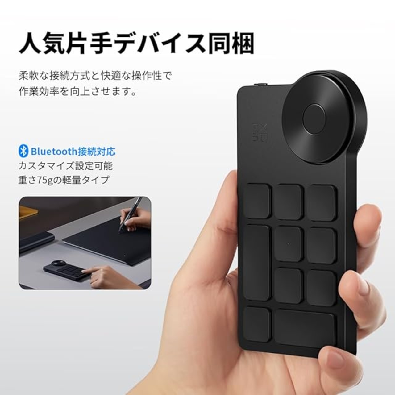【人気左手デバイス付き】ACK05は12.7×7×1cmの小型左手デバイス。本体重量:約75g。各ボタンにお好みの機能を自由に割り当てることができるので、ペンタブレットと併せて利用する事で作業効率を向上。お絵描きだけではなく動画編集、音声編集やCAD、事務作業などにも便利です。