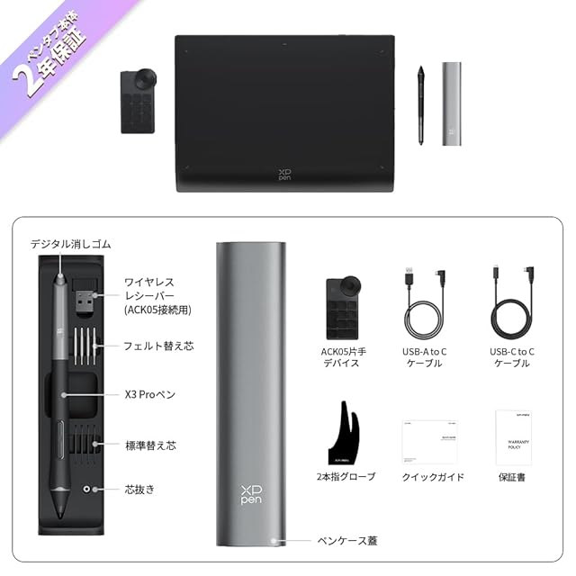 XPPen ペンタブ 15x9インチ ペンタブレット 16Kレベルの筆圧検知 ワイヤレスショートカットリモート付き Android Windows MacOS Linux対応 Deco Pro XLW (Gen2) 【X3 Proペン】Deco Pro(Gen 2)シリーズはX3 Proペンを搭載する。新型X3 Proスマートチップスタイラスは世界初となる16384レベルの筆圧感度を実現し、従来の約2倍の検知能力で滑らかな描き心地、より効率的に創作でき、正確な描線でアートの世界のあらゆるディテールを優れた表現できます。ポジショニングがより精確になり、遅延や入力漏れ、微細な誤検知もなく、効率的な作業と滑らかな描き心地を提供します。 【One Paperデザイン板タブ】作業環境に合わせて選べる3つの本体サイズをご用意しました。本体表面は紙のように余計な段差はなく、枠も、ボタンも、隙間もありません。従来の紙とペンに限りなく近い、没入感のあるデザインはアーティストの最も根源的な創作体験を再現します。大きな作業エリアで、より自由に創作活動を行えるスペースを確保します。【Bluetooth 5.0接続】Bluetooth 5.0のワイヤレス接続に対応し、端末と容易かつ、より高速で安定した接続が可能。設置場所を選ばず、わずらわしいケーブルから解放します。また、大容量リチウムバッテリー(3030mAh/3.7V)の搭載により、最大10時間以上連続動作。1日中電源を持続させることができます。【左手デバイス付き】ACK05ワイヤレスショートカットリモートはコンパクトで持ち運びやすく、ポケットにすっぽり収まるサイズ。有線モードとBluetoothモードに対応しており、柔軟な接続方式と快適な操作性で作業効率を向上させます。【広い互換性】Adobe Photoshop、Illustrator、SAI、CDR、GIMP、Krita、MediBang、FireAlpaca、Toonboom、Maya、Blender3Dなどの幅広いイラスト・編集ソフトウェアに対応します。購入特典:本商品をご購入いただきますと、「openCanvas7」「Artrage 6」のいずれかおひとつをプレゼント。:お買い上げから2年間。ご質問やお困りの点等ございましたら、いつでもお気軽にXPPenサポートセンターまでお問い合わせ下さい。