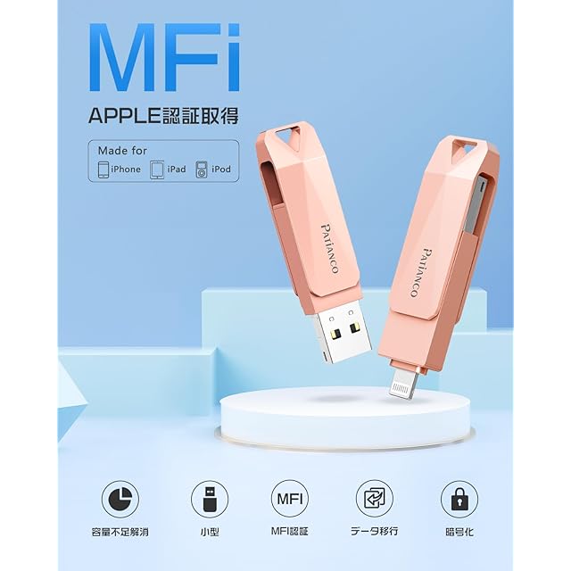 【MFi認証取得】弊社のUSBメモリーはMFi認証品であり、iPhone/iPad/iPod/との互換性をすることを示すものです。MFi認証のある製品はApple社に認定されていると同義であり、互換性も保障されていて、安全に利用できることを証明しています。ご購入の際は、MFi認証のあるiPhone用USBメモリをご確認ください。