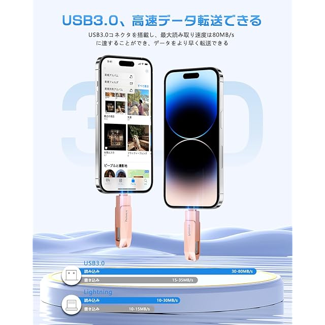 【高い互換性】弊社のUSBメモリはすべてのiOS機種に対応し、タイプCアダプターも付属しておるので、Type-CコネクタのiPhone、iPad、Type-C機種とも互換性があります。対応機種:iPhone 15 Pro Max/15 Pro/15 Plus/15/iPhone 14 Pro Max/14 Pro/14 Plus/14/SE 3/13 Pro Max/13 Pro /13/13 mini /12 Pro Max/12 Pro/12 /SE 2 /11 Pro Max/11 Pro/11 /XR/XS Max/XS /X /8 Plus/8/7 Plus/7/SE 1/6s Plus /6s/6 Plus/6/ iPad Pro(第1/2/3/4/5/6世代)/ iPad Air(第1/2/3/4/5世代)/ MacBook(Pro/Air)/ iPad mini(第1/2/3/4/5世代)/ iPad(第5/6/7/8/9/10世代)/ PC /ノートパソコン/ Type-C機種などと互換性があります。