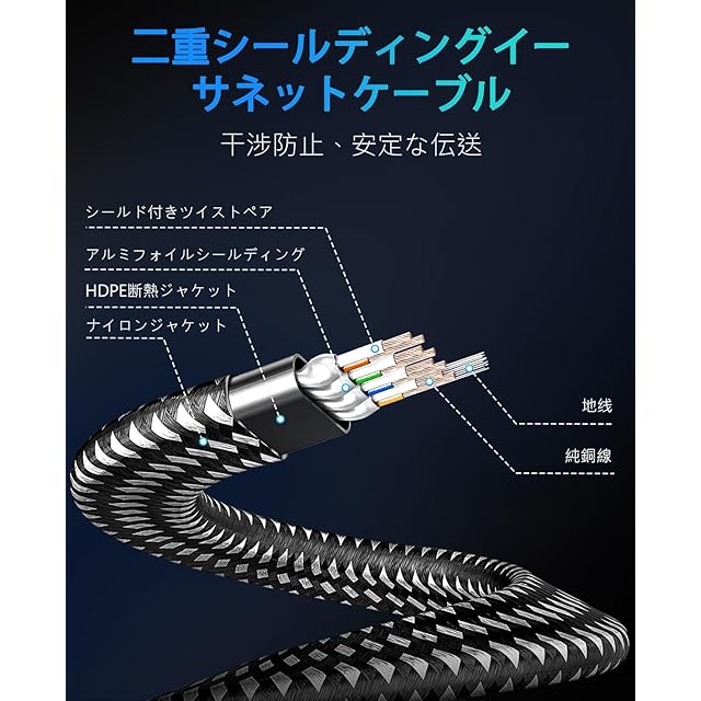 ユニバーサルRJ45コネクタ:両端コネクタ付(8芯 鍍金RJ45 スリムコネクタ採用)。内蔵100%裸銅線(シールドケーブル)。ツメ折れ防止カバー、曲げても折れない。ノイズ干渉も強い、高速で安定した。な難燃性、耐久性、耐候性