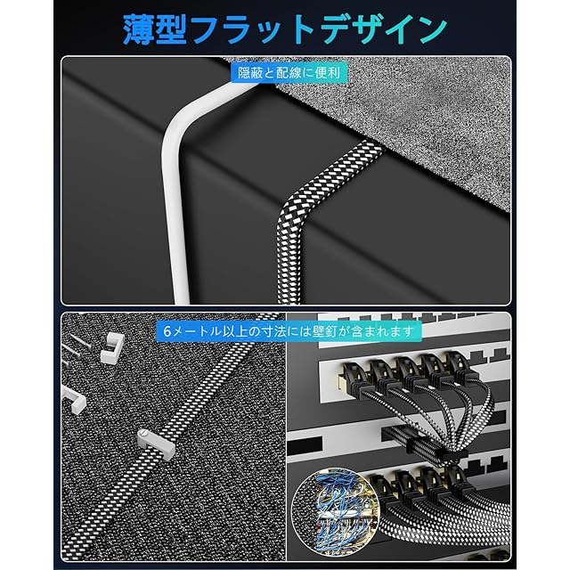 丈夫な編組デザイン: フラット超薄型、LANケーブル, 二重編組ナイロンの外装により、Cat-8イーサネットケーブルはより耐久性が高く、柔軟性があり、絡まりません。 に柔軟性に優れ、スリムながら頑丈で、壁に沿って並ぶのが簡単で、狭いところに大掛りな配線工事が心配なしで取り回しが効き配線できます