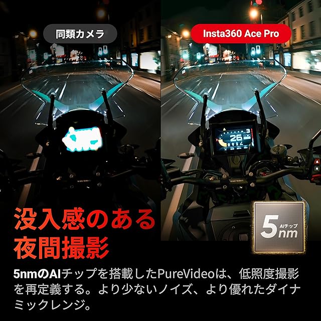 1/1.3インチセンサーと5nmAI チップ搭載:大型のプレミアムなセンサーを搭載したAce Proアクションカメラは、より多くの光を取り込み、画質を飛躍的に向上させます。 Ace Proはまた、強力な5nmAI チップを組み込んだ初のアクションカメラ 。センサーの能力を最大化し、ノイズを低減し低照度 イメージの明るさを増幅します。AI技術を詰め込むことで、高度な画質向上が実現されます。