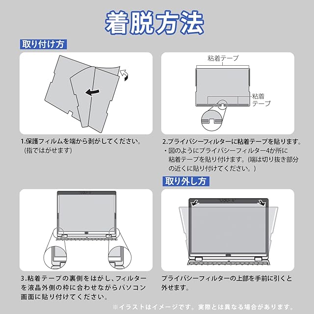 ◎高透過率:のぞき見はしっかりガードしつつ、透過率は65%と程よく調整しているので、レッツノート( CF-SR3 / CF-QR4 ) にプライバシーフィルターをずっと装着していても違和感がありません。◎貼り付け方法:フィルターの外側に粘着テープを貼り、Let's Noteの画面の外枠に貼り付けることによって固定するタイプの保護フィルムです。