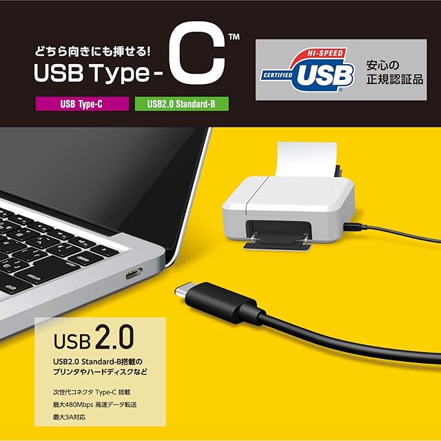 商品名:エレコム USBケーブル Type C (USB C to USB B) 4.0m USB2.0認証品 3A出力 最大480Mbps ブラック U2C-CB40NBK