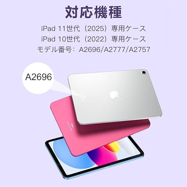 このキーボード ケースは対応iPad(A16)2025発売 A3354/A3355/A3356,iPad (10世代) 2022発売 A2696/A2757/A2777に対応しています。ご注文前にアイパッド裏面のモデルを確認ください。ご注意:本製品は本体iPadとApple用 pencilを含めません。ご注意:この製品の重量は830gです