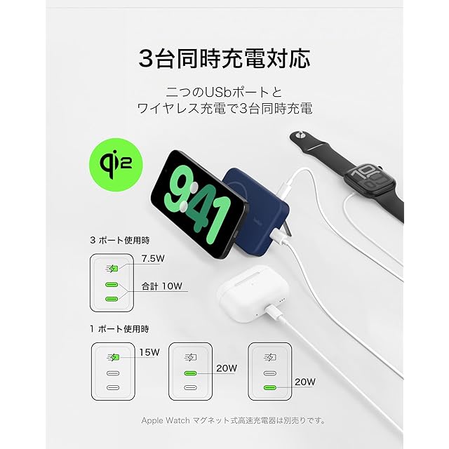 【三台同時対応】ワイヤレスと二つのUSB-Cポートを利用して最大三台同時充電を実現,外出先でもiPhoneとAirPods、Apple Watch(有線)の同時充電も可能
