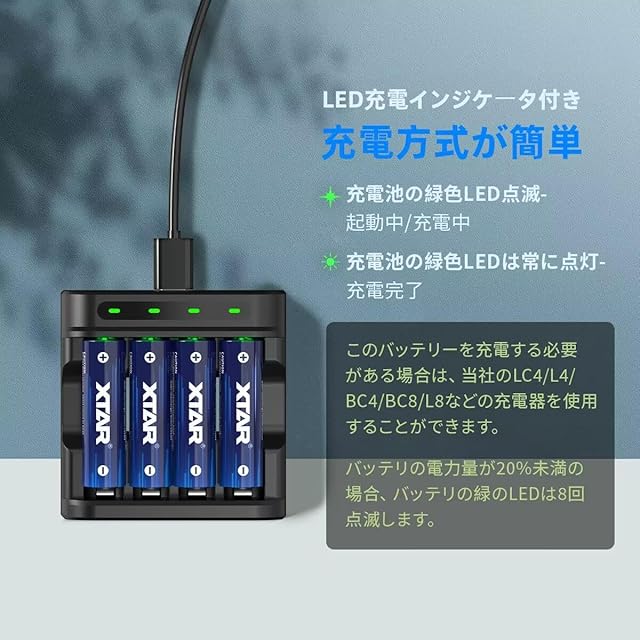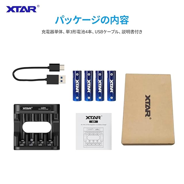 商品名:XTAR 1.5V充電池 4150mWh 単3形 リチウム電池4本 【LED充電インジケータ付き】LC4充電器の組み合わせ